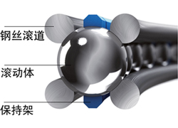 基于該原理:軸承的核心部件由四條鋼絲滾道組成。采用專(zhuān)門(mén)研發(fā)的磨削工藝,使其滾道與滾珠直徑完全匹配,滾動(dòng)體在四條鋼絲滾道上平滑滾動(dòng),不與周?chē)Y構發(fā)生接觸。借助四點(diǎn)接觸幾何結構,可承受來(lái)自任何方向的負荷。